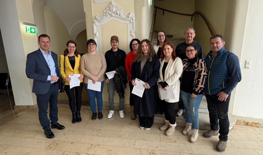 Bgm. Daniel Kos, Daniela Hofmann, Sabine Erlatsch, Manuel Zweytik, Ingeborg Griesmaier, Lisa Scheucher, Elisabeth Kure, Claudia Ramschak, Stadtamtsdirektor Werner Obruly und die Personalvertreter Tina Muchitsch und Norbert Wiesner (v.l.n.r.) Foto: (c) Stadtgemeinde Leibnitz/Gsell