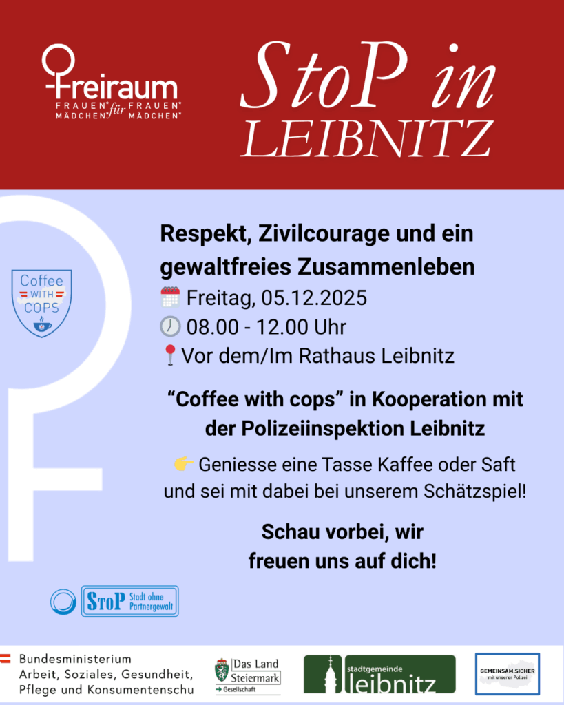 Im Rahmen der Initiative „Gemeinsam.Sicher“ findet in Kooperation mit der Polizeiinspektion Leibnitz und dem Verein Freiraum am 5. Dezember 2025 von 8:00 bis 12:00 Uhr wieder die Aktion „Coffee with Cops“ statt. In bzw. vor dem Rathaus lädt die Polizeistation zum direkten Austausch mit Polizisten ein.