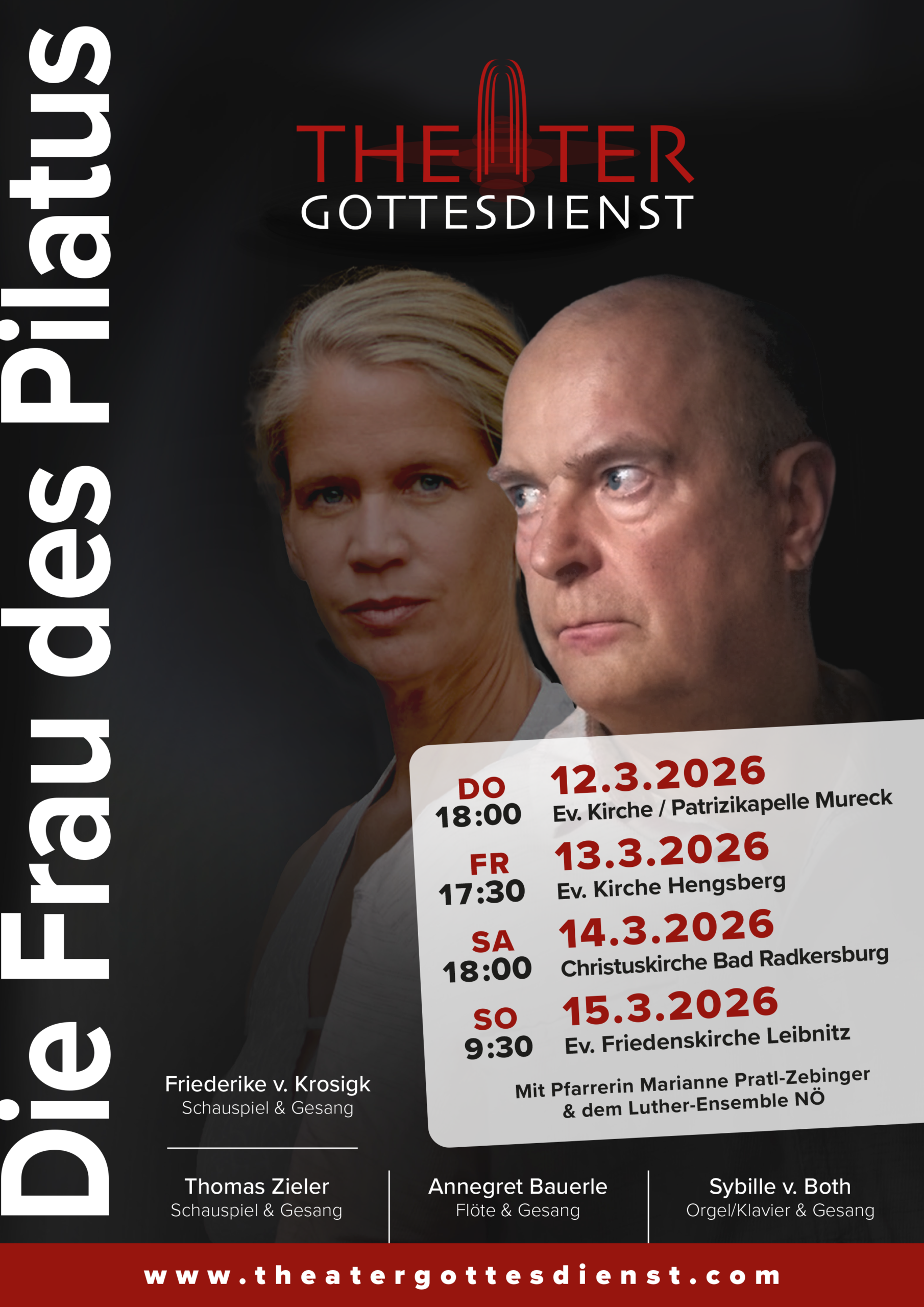 Am Sonntag, dem 15. März 2026, findet um 9.30 Uhr mit „Die Frau des Pilatus“ ein Theatergottesdienst mit Pfarrerin Marianne Partl-Zebinger und dem Luther-Ensemble Niederösterreich in der evangelischen Friedenskirche in Leibnitz statt.