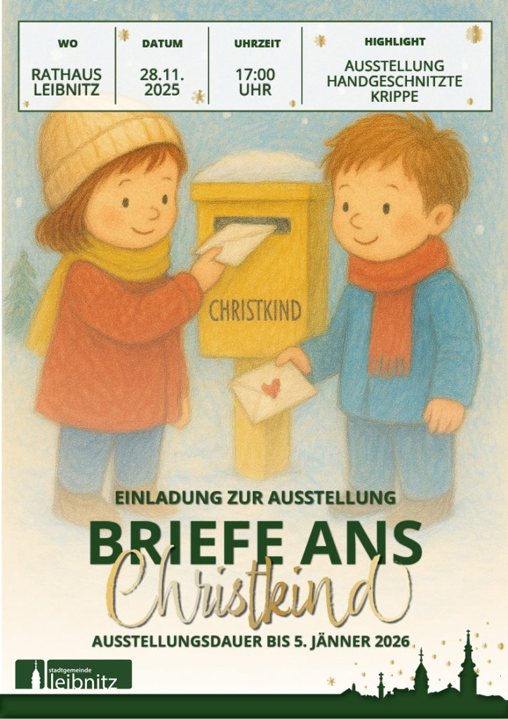Die Ausstellung „Briefe ans Christkind“ im Rathaus Leibnitz lädt ab 28. November 2025 zur stimmungsvollen Einstimmung auf die Advent- und Weihnachtszeit ein. Im Rahmen der Vernissage wird die Vielfalt an liebevoll gestalteten Briefen und Zeichnungen der Kindergarten- und Volkschulkinder unserer Stadt präsentiert, die berührende Einblicke in weihnachtliche Wünsche und Gedanken geben.
