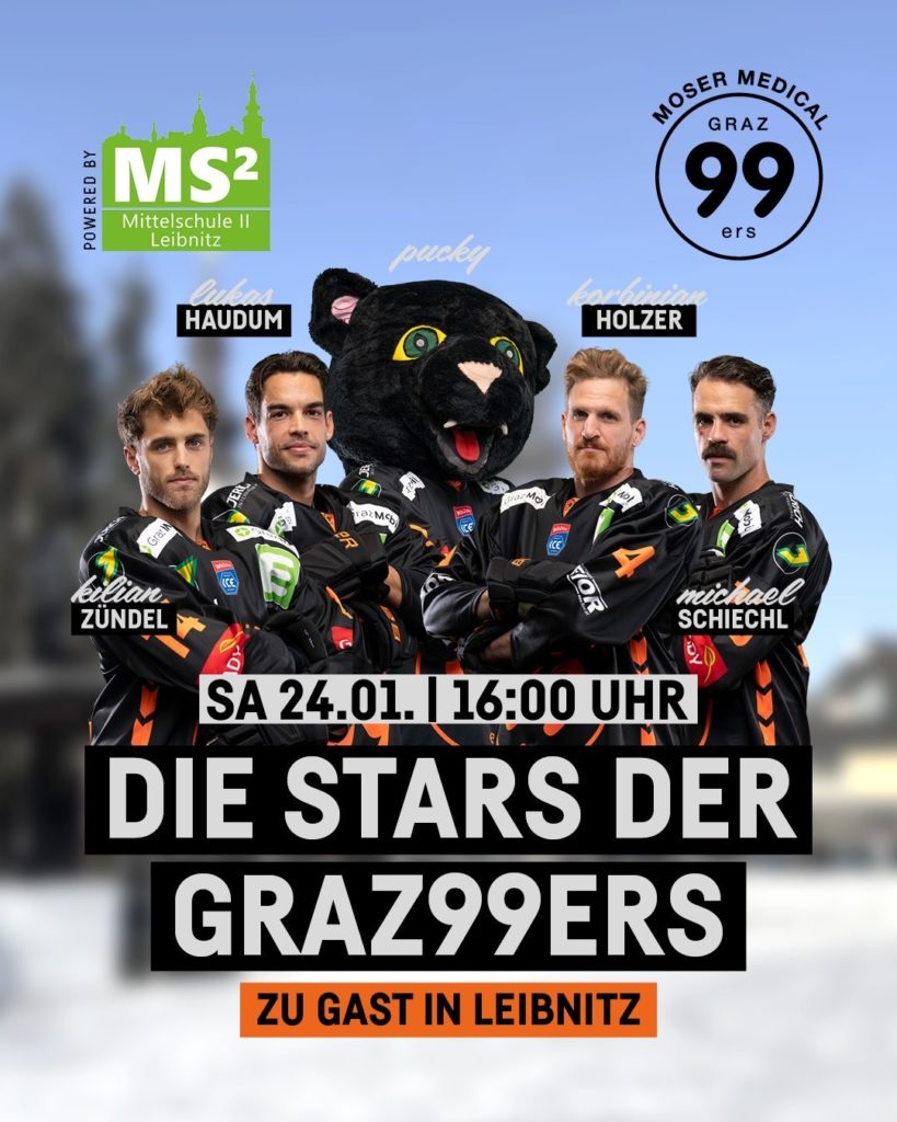 Am Samstag, 24.01.2026, sind die Stars der Graz99ers ab 16:00 Uhr am Eislaufplatz in Leibnitz, Bahnhofstraße 12, 8430 Leibnitz, mit Rahmenprogramm und Autogrammstunde zu Gast.