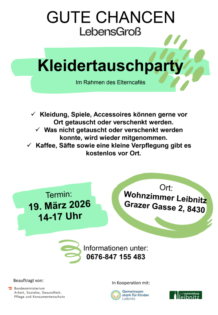 Am 19. März 2016 findet von 14:00 -17:00 Uhr die Kleidertauschparty im Rahmen des Leibnitzer Elterncafés im Wohnzimmer Leibnitz, Grazer Gasse 2, 8430 Leibnitz, statt.