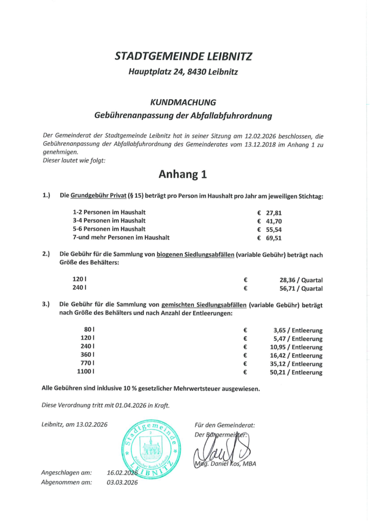 Der Gemeinderat der Stadtgemeinde Leibnitz hat in seiner Sitzung am 12.02.2026 beschlossen, die Gebührenanpassung der Abfallabfuhrordnung des Gemeinderates vom 13.12.2018 im Anhang 1 zu genehmigen.