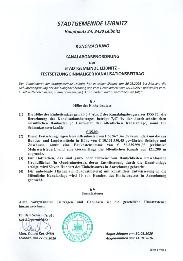 Der Gemeinderat der Stadtgemeinde Leibnitz hat in seiner Sitzung am 26.03.2026 beschlossen, die Gebührenanpassung der Kanalabgabenordnung wie vom Gemeinderat vom 05.12.2017 und weiter vom 13.02.2026 beschlossen, nunmehr weiters in § 3 abzuändern und zu verordnen wie folgt: