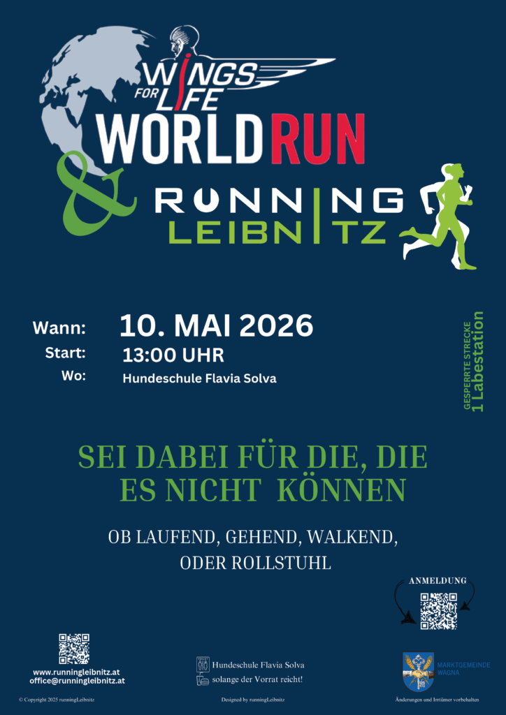 Laufschuhe bereit? Ob Einsteiger, ambitionierte Läufer oder Rollstuhlfahrer: RunningLeibnitz veranstaltet am 10. Mai 2026 ab 13.00 Uhr wieder eine Charity-Laufveranstaltung im Rahmen des Wings for Life World Runs.