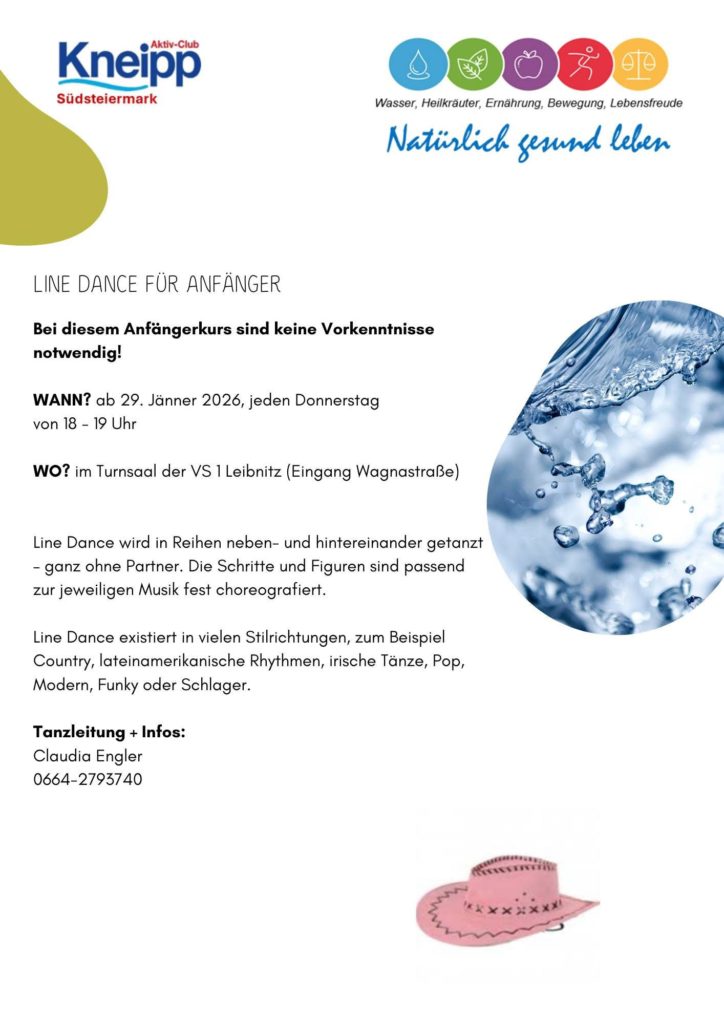 Der Kneipp Aktiv-Club Steiermark veranstaltet ab 29. Jänner 2026 jeden Donnerstag von 18:00 – 19:00 Uhr einen Line Dance Anfängerkurs im Turnsaal der VS 1 Leibnitz.