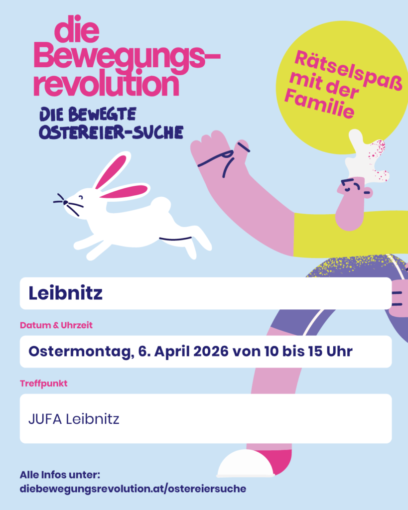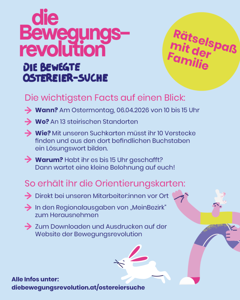 Am Ostermontag, dem 6. April 2026, lädt die Bewegungsrevolution zur Bewegten Ostereier-Suche ein. Besucher holen sich vor Ort eine Suchkarte, aktivieren ihre Abenteuerlust und machen sich auf die Suche nach zehn eierförmigen Tafeln, die beim JUFA Leibnitz/Stadtpark versteckt sind. Wer alle Verstecke findet und das Rätsel löst, erhält ein kleines Präsent.