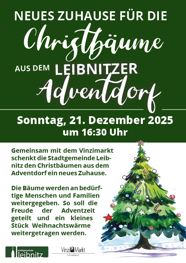 Gemeinsam mit dem Vinzimarkt schenkt die Stadtgemeinde Leibnitz am Sonntag, 21. Dezember 2025, um 16:30 Uhr, den Christbäumen aus dem Adventdorf ein neues Zuhause.