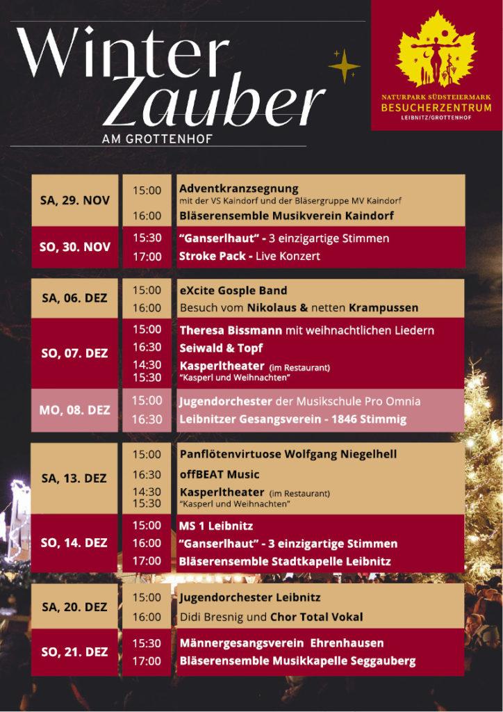 Bereits zum 15. Mal öffnet der Adventmarkt am Grottenhof seine Pforten und bietet ein stimmungsvolles Erlebnis in der Vorweihnachtszeit. An den vier Adventwochenenden präsentieren mehr als 60 sorgfältig gestaltete Stände hochwertiges Kunsthandwerk. Der Duft winterlicher Köstlichkeiten und heißer Getränke lädt an zahlreichen Genussständen zum Verweilen ein.