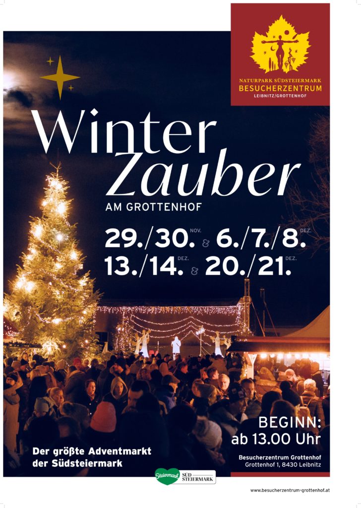 Bereits zum 15. Mal öffnet der Adventmarkt am Grottenhof seine Pforten und bietet ein stimmungsvolles Erlebnis in der Vorweihnachtszeit. An den vier Adventwochenenden präsentieren mehr als 60 sorgfältig gestaltete Stände hochwertiges Kunsthandwerk. Der Duft winterlicher Köstlichkeiten und heißer Getränke lädt an zahlreichen Genussständen zum Verweilen ein.